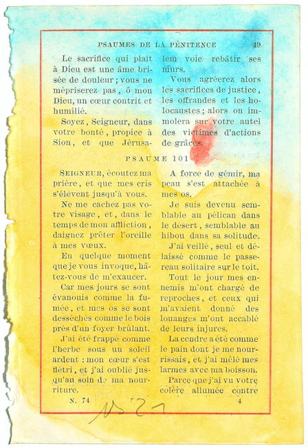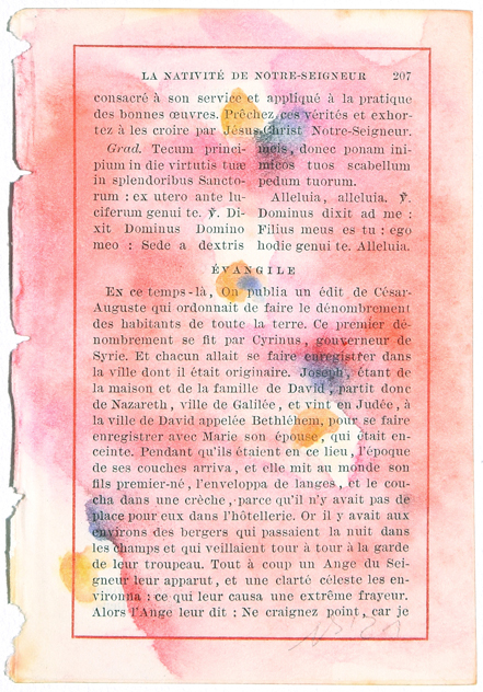 That tiny book decided to convince me that there can’t be a Gods commandment, only Mans! It can only be a person that reflected on the creation of such a text. So, I took away those locked up and dusty words, those litanies of promises and threats written by Man, that religious and misleading prison. My aspiration for freedom allowed me to break the chains of the past to remove, one by one, those 258 pages dating back to 1876. I let traces flow on them, free thoughts, emerging from the extension of my own blood pulse. Sometimes joyful, sometimes sad, they cover, full of softness, these delicate pages with bitter tears, fluttering while singing against a deep wound.